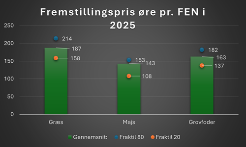 Derfor har vi i rådgivningen lavet driftsgrensfordeling samlet for hele grovfoderproduktionen, græs-, helsæds- og majsensilage, med en gennemsnitlig fremstillingspris pr. fe, hvor vi ikke kan skille fremstillingsprisen på græs og majs individuelt.